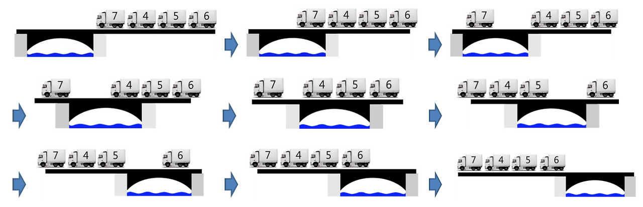 Figure 1. 본문의 예에 대해 트럭들이 다리를 건너는 과정.